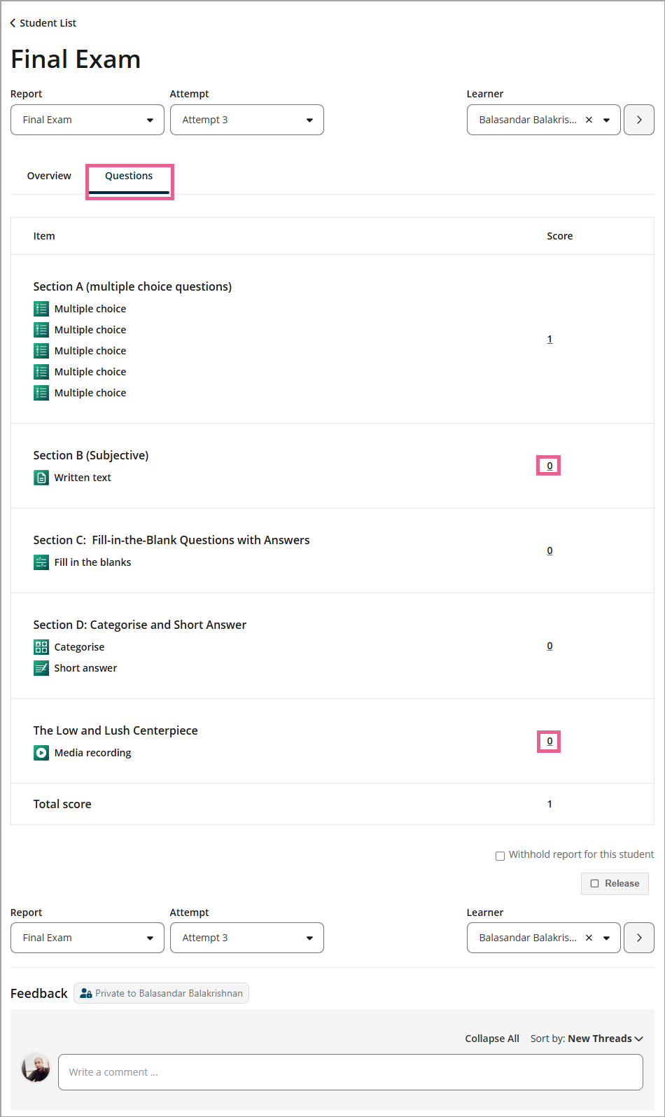 In the Questions tab, you will find the scores for each exam section and the total score. For subjective responses (like written text or media recordings), select the specific question to review the submission and enter a score based on the assessment guidelines. It is best to review all sections before you release the total score.